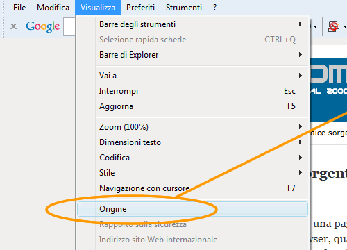 Con il browser della Microsoft abbiamo due possibilità di accesso. Si può visualizzare il codice sorgente HTML della pagina cliccando sulla voce "Origine" del menù "Visualizza", posto sulla barra orizzontale superiore, come nella seguente figura.
