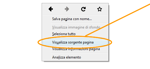 In alternativa, e molto più rapidamente, possiamo cliccare sul tasto destro del mouse sulla pagina, far apparire il menù a pop-up e selezionare la voce "Visualizza sorgente pagina".