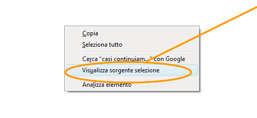Firefox ci offre anche la possibilità di visualizzare soltanto il codice Html di una zona della pagina. È sufficiente selezionare la parte del documento che ci interessa, cliccare sul tasto destro del mouse e selezionare la voce "Visualizza sorgente selezione".