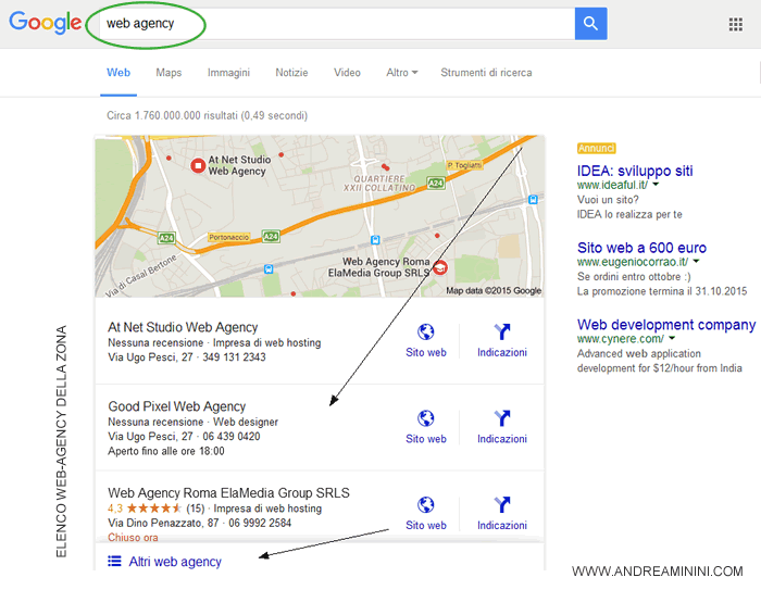 Cercando su Google il termine "web agency" il motore di ricerca restituisce un elenco di società informatiche più vicine.