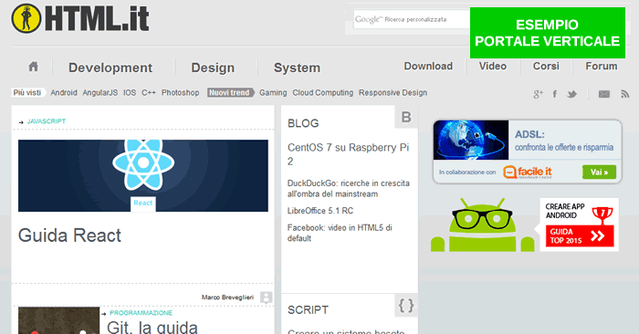 - Portale verticale. E' una raccolta di informazioni, news e guide relative a un particolare argomento o materia. Ad esempio una guida sulla domotica, sulla pesca, ecc.
