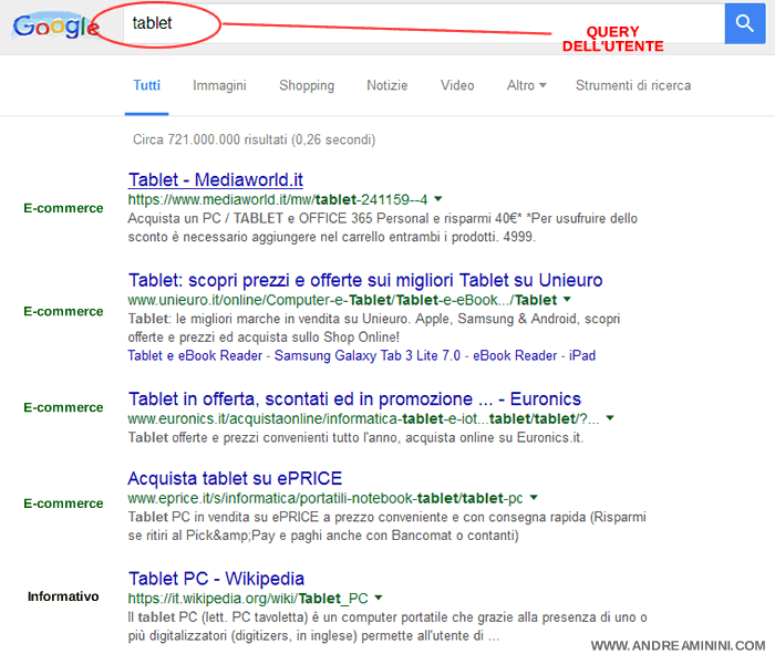 Esempio. Se cerco "tablet" su Google è molto probabile che ne voglia acquistare uno. Diversi siti specializzati nel commercio elettronico vendono questo articolo online, quindi il motore di ricerca mi fa vedere prevalentemente i risultati provenienti dai siti web e-commerce italiani.