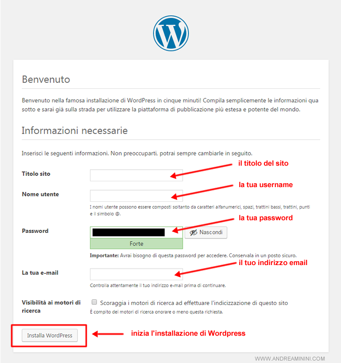 Per installare il cms Wordpress sul sito web sono sufficienti pochi passi: