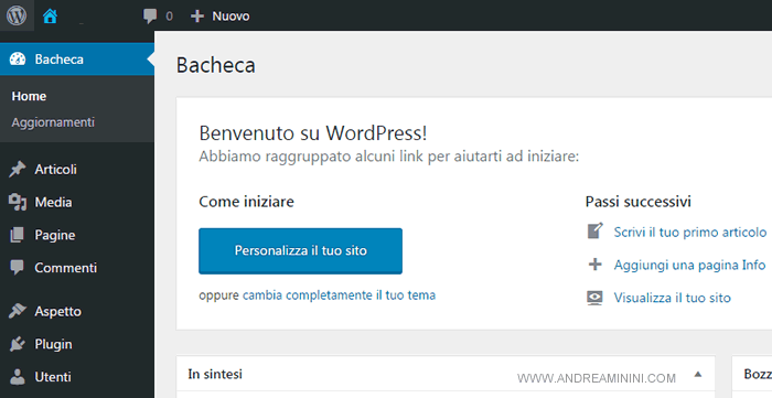 Ora posso cominciare a personalizzare Wordpress, scegliere il template grafico del sito web e pubblicare i primi contenuti.