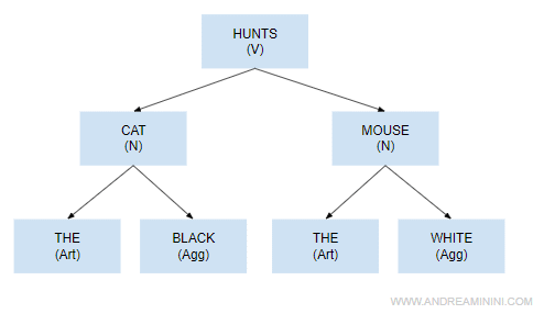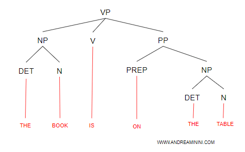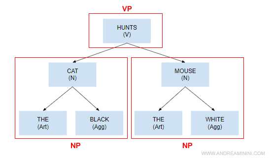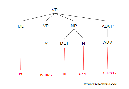 Nota. La struttura generale di una frase verbale è V | MD [VP] [NP] [PP] [ADJP] [ADVP]. Dove è un verbo (V) o un verbo modale/ausiliario (MD), seguiti opzionalmente da un'altra frase verbale (VP) o nominale (NP), da una frase preposizionale (PP), aggettivale (ADJP) o avverbiale (ADVP). Tutti gli elementi tra parentesi quadre sono opzionali. Ecco un esempio di albero sintattico.