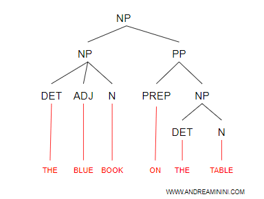 Nota. La forma generale di un gruppo NP è [DET][ADJ] N [PP] ossa articolo DET, aggettivo ADJ, nome N, preposizione PP. Gli elementi tra parentesi quadre sono opzionali. Ecco un albero sintattico di una frase sostantiva.