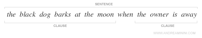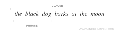 - Clause. E' un gruppo di parole con soggetti e predicati. Ad esempio, "the black dog barks at the moon". Si avvicina al concetto di proposizione in italiano. In alcuni casi le clause formano una sentence semplice, in altri casi no.