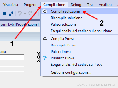 Per avviare la compilazione di un progetto o di un'intera soluzione in Visual Basic, seleziono il menù Compilazione (Build) nel menù superiore.