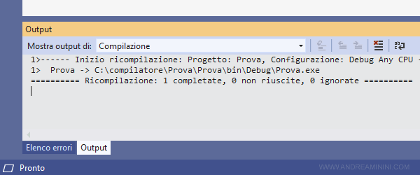 Se non ci sono errori, i file eseguibili del progetto/soluzione sono salvati nella sottocartella bin del progetto principale.