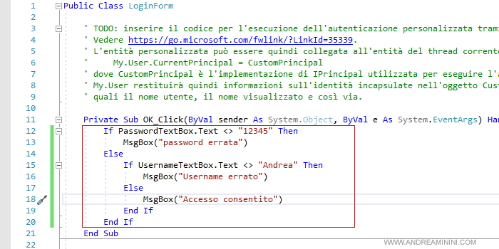 - Se il valore digitato nella casella username (UsernameTextBox.Text ) è diverso da "Andrea" il programma apre una finestra di errore con l'avviso "password errata".