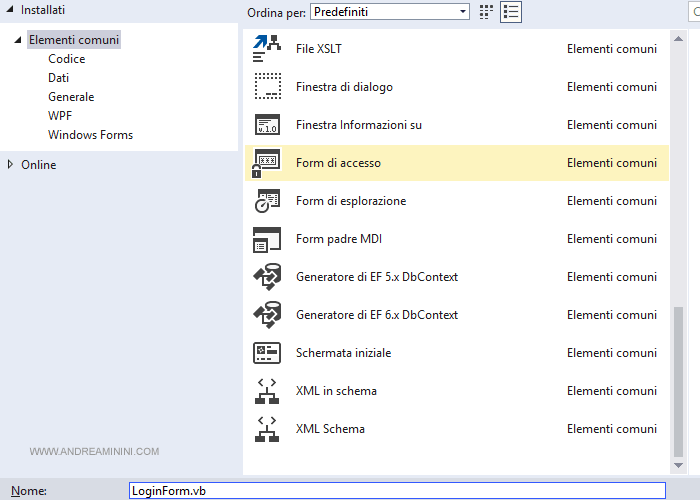 Poi seleziono Form di accesso sotto la voce Windows Forms.
