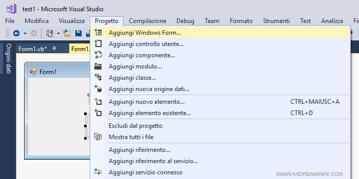 Poi seleziono la voce di menu Aggiungi Windows Form.