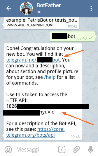 La procedura è finita. Nel messaggio successivo Botfather conferma la creazione del nuovo bot e indica il link ufficiale del bot e una chiave ( token ) HTTP API da utilizzare nelle applicazioni esterne per comunicare con il bot.