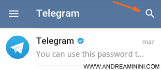 Si entra su Telegram con il proprio account personale, poi si preme sull'icona della lente di ingrandimento in alto a destra.
