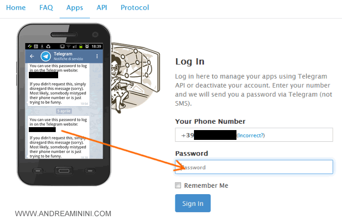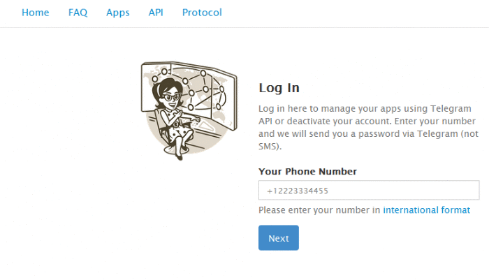 Occorre loggarsi con il proprio numero di telefono, lo stesso usato per la registrazione del proprio utente su Telegram, all'indirizzo ufficiale https://my.telegram.org/auth?to=apps