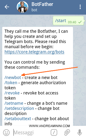 Si entra così nella pagina principale di BotFather dove sono elencati tutti i comandi operativi dell'applicazione. Per eseguirli si possono digitare nel campo dei messaggi chat oppure, in alternativa, si può premere sul comando come fosse un link. Per creare un nuovo bot si clicca sul comando /newbot.