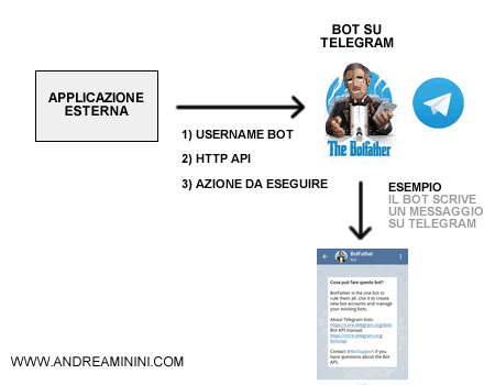 Ad esempio, l'applicazione esterna può comandare al bot di postare un messaggio su Telegram oppure condividere una news appena pubblicata sul sito web, ecc.