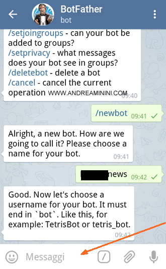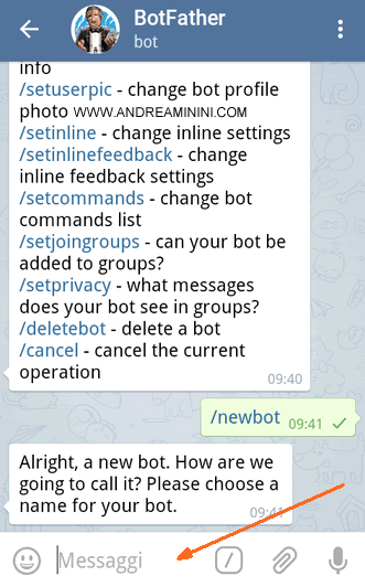 Dopo aver cliccato o digitato il comando /newbot l'applicazione chiede di scrivere il nome del bot tramite il campo dei messaggi in basso. E' il nome pubblico del bot, quello che tutti gli altri utenti vedranno.
